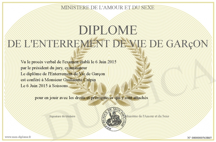 Envoyez par email votre Diplôme de l'Enterrement de Vie de Garçon personalisé