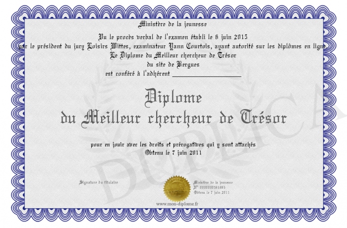 Envoyez par email votre Diplôme du Meilleur chercheur de Trésor personalisé