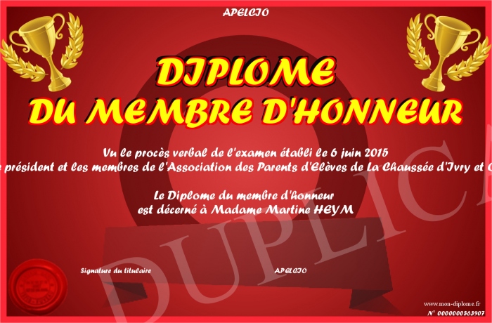 Envoyez par email votre DIPLOME DU MEMBRE D'HONNEUR personalisé