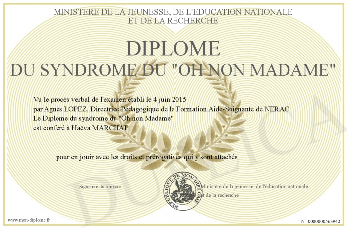 Envoyez par email votre Diplôme du syndrome du -Oh non Madame- personalisé