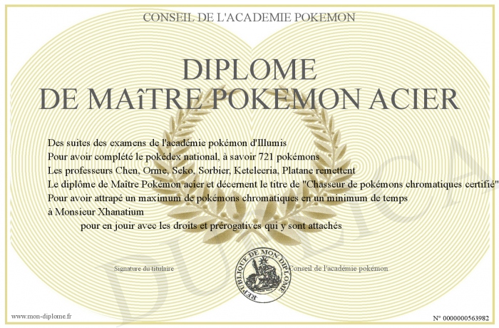 Envoyez par email votre Diplôme de maître pokémon acier personalisé