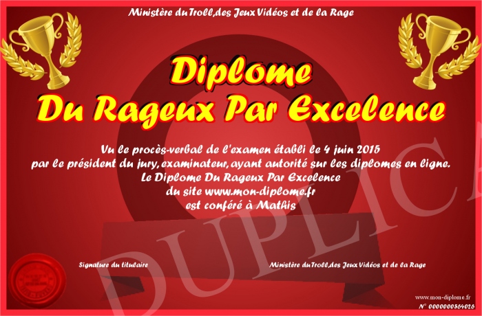 Envoyez par email votre Diplome Du Rageux Par Excelence personalisé