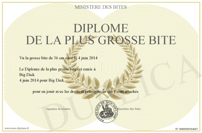 Envoyez par email votre Diplôme de la plus grosse bite personalisé
