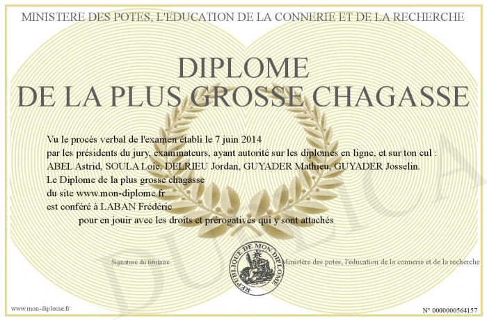 Envoyez par email votre Diplôme de la plus grosse chagasse personalisé