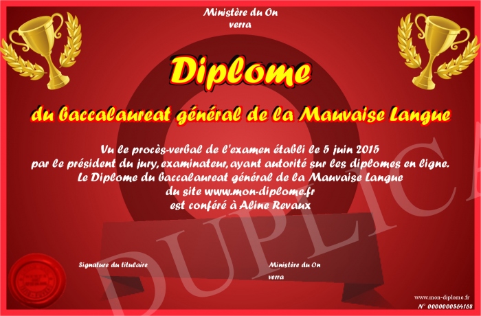Envoyez par email votre Diplôme du baccalaureat général de la Mauvaise Langue personalisé