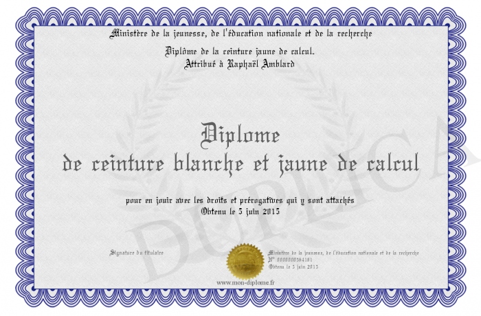 Envoyez par email votre Diplôme de ceinture blanche et jaune de calcul personalisé