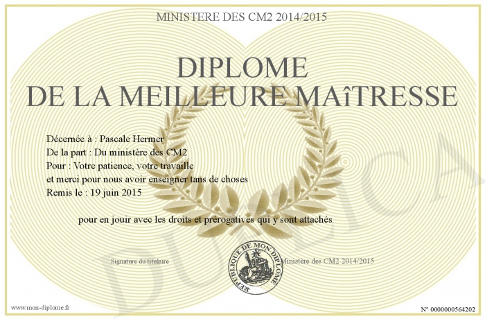 Envoyez par email votre Diplôme de la meilleure maîtresse personalisé