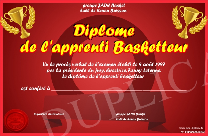 Envoyez par email votre Diplôme de l'apprenti Basketteur personalisé
