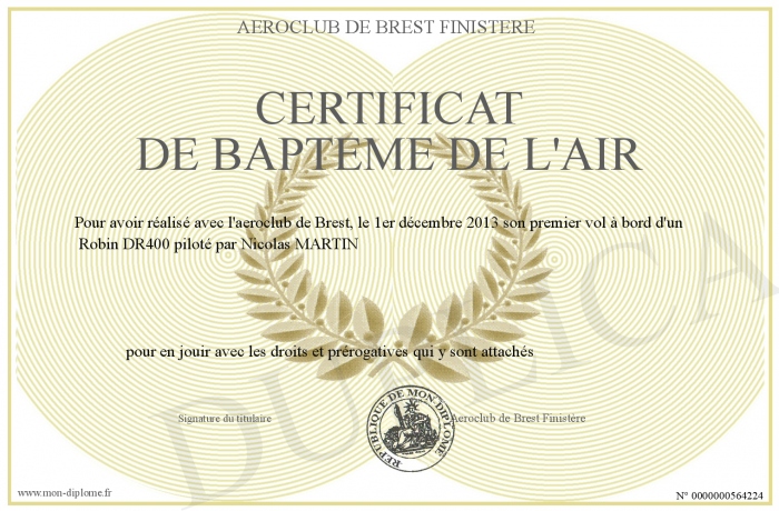 Envoyez par email votre certificat de bapteme de l'air personalisé