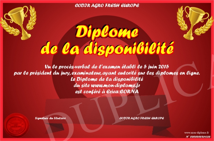 Envoyez par email votre Diplôme de la disponibilité personalisé