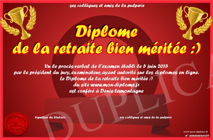 Envoyez par email votre Diplôme de la retraite bien méritée :) personalisé