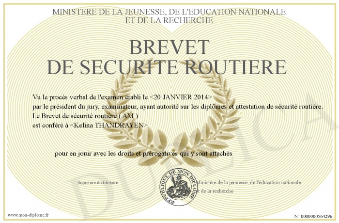 Envoyez par email votre Brevet de sécurité routière personalisé