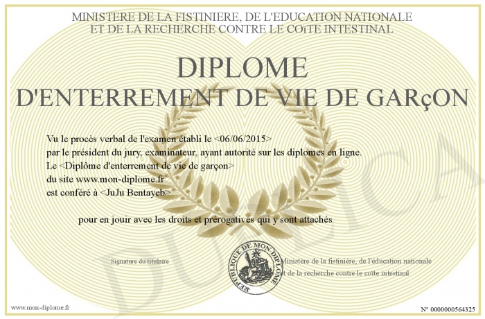 Envoyez par email votre Diplôme d'Enterrement de Vie de Garçon personalisé