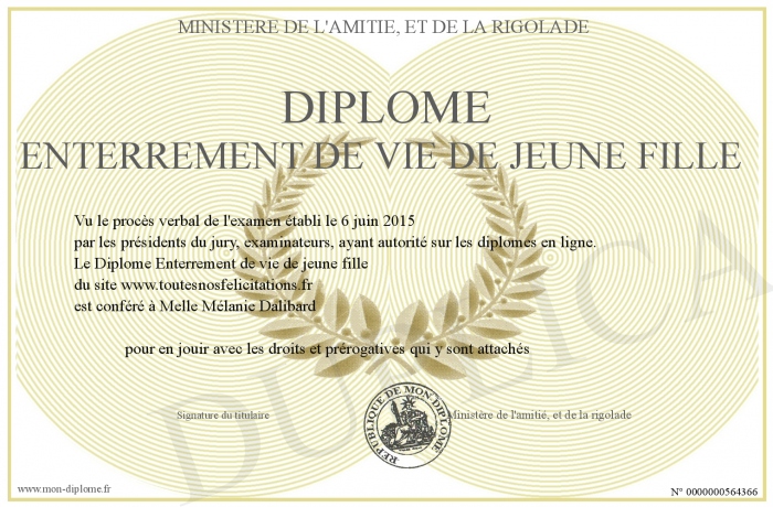 Envoyez par email votre Diplôme Enterrement de vie de jeune fille personalisé