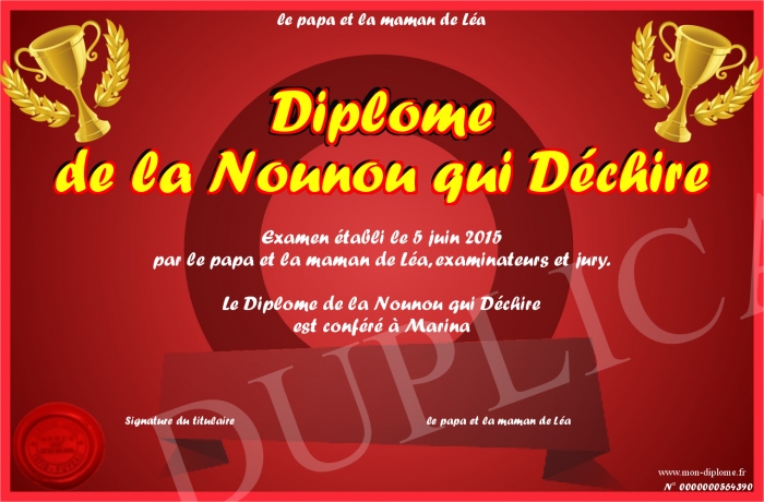 Envoyez par email votre Diplôme de la Nounou qui Déchire personalisé