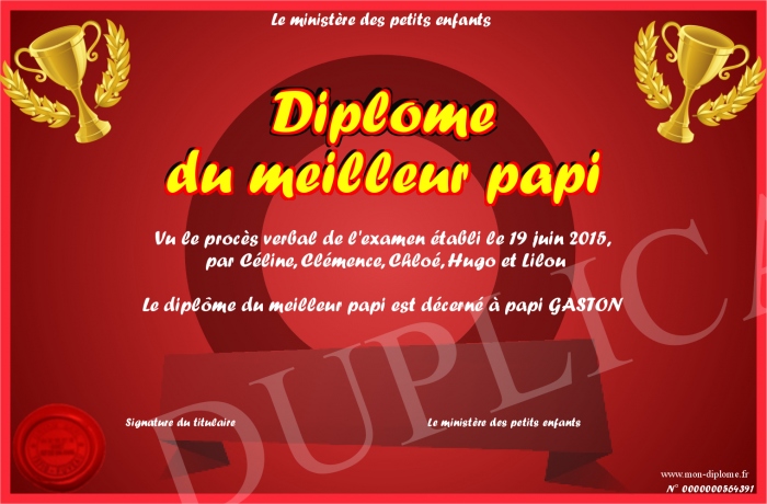 Envoyez par email votre Diplôme du meilleur papi personalisé