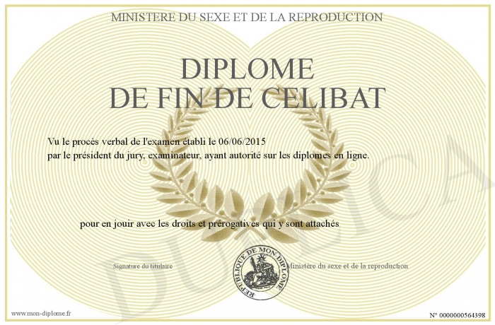 Envoyez par email votre Diplôme de fin de célibat personalisé