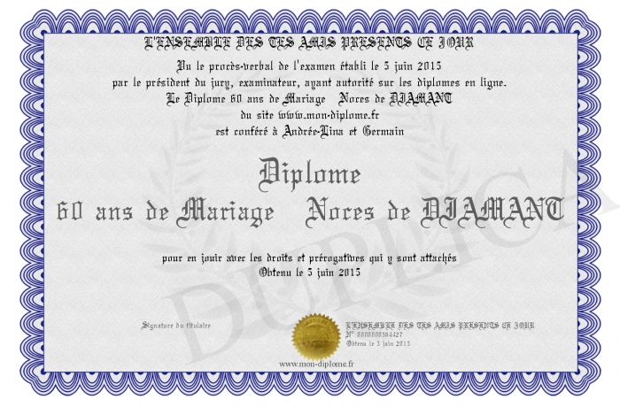 Envoyez par email votre Diplôme 60 ans de Mariage Noces de DIAMANT personalisé