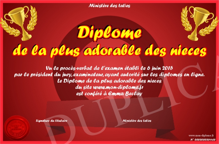Envoyez par email votre Diplôme de la plus adorable des nieces personalisé
