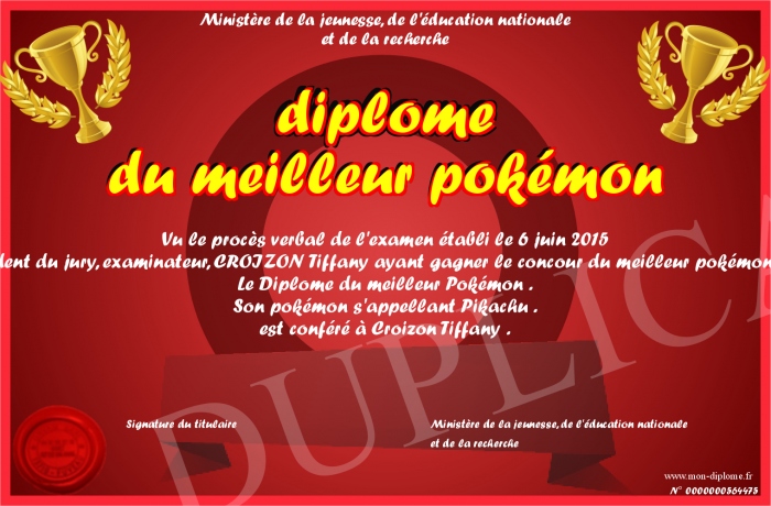 Envoyez par email votre diplome du meilleur pokémon personalisé