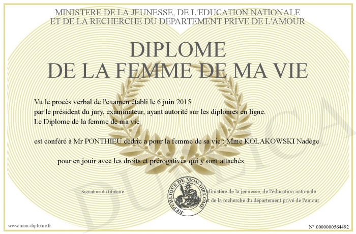 Envoyez par email votre Diplôme de la femme de ma vie personalisé