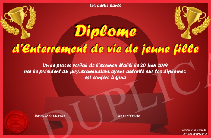 Envoyez par email votre Diplome d'Enterrement de vie de jeune fille personalisé