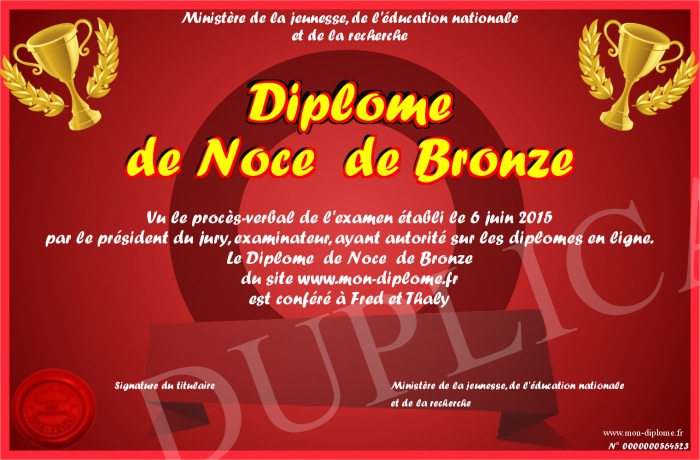 Envoyez par email votre Diplôme de Noce de Bronze personalisé