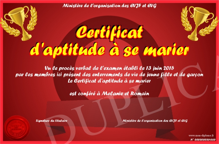 Envoyez par email votre Certificat d'aptitude à se marier personalisé