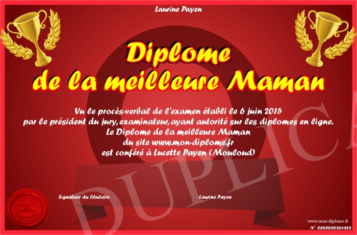 Envoyez par email votre Diplome de la meilleure Maman personalisé