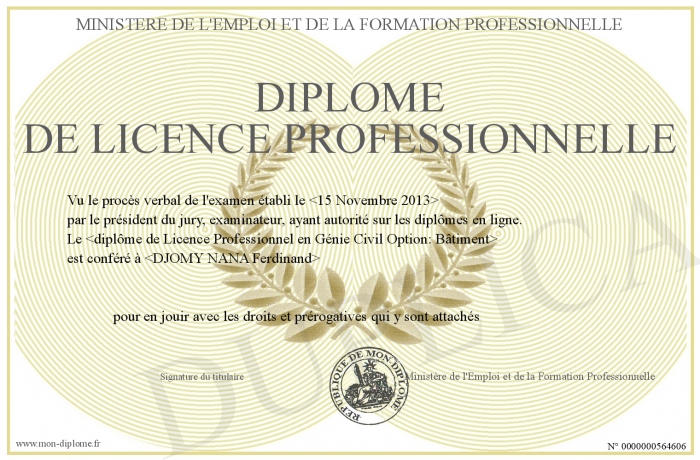 Envoyez par email votre Diplome de Licence Professionnelle personalisé