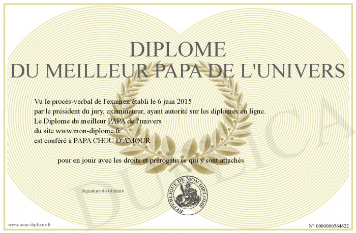 Envoyez par email votre Diplôme du meilleur PAPA de l'univers personalisé