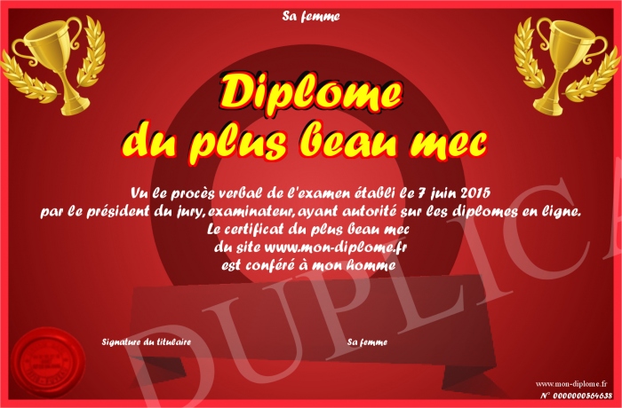 Envoyez par email votre Diplôme du plus beau mec personalisé