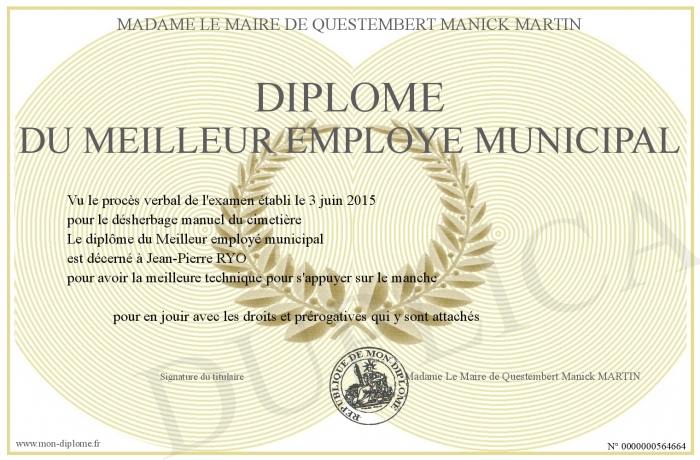 Envoyez par email votre Diplôme du Meilleur employé Municipal personalisé