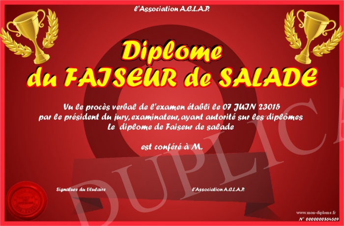 Envoyez par email votre Diplôme du FAISEUR de SALADE personalisé