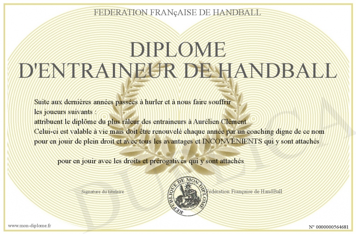 Envoyez par email votre DIPLOME D'ENTRAINEUR DE HANDBALL personalisé