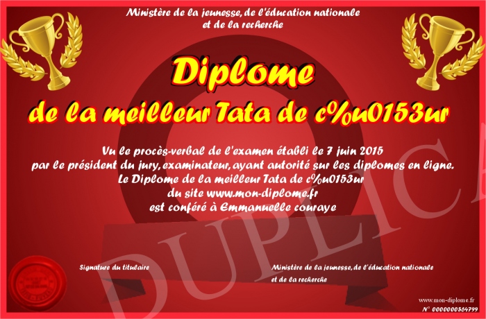 Envoyez par email votre Diplôme de la meilleur Tata de coeur personalisé