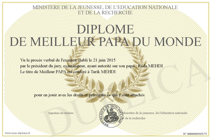 Envoyez par email votre Diplôme de meilleur papa du monde personalisé