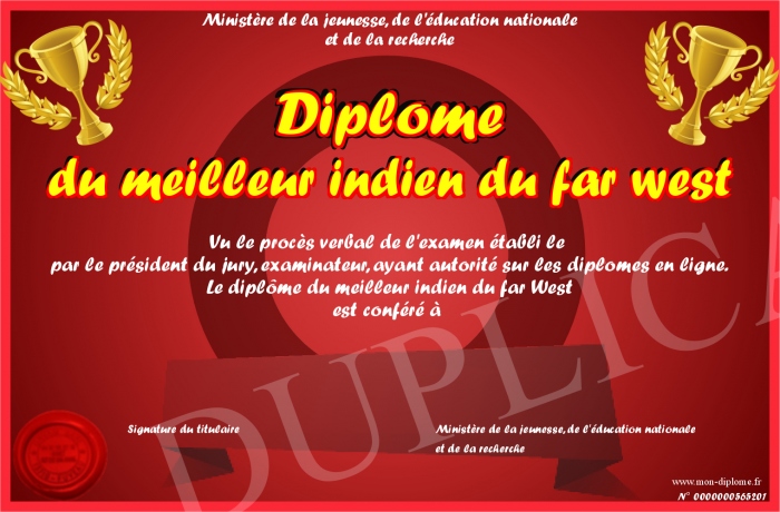 Envoyez par email votre Diplôme du meilleur indien du far west personalisé