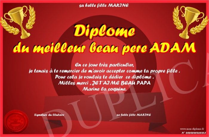 Envoyez par email votre Diplôme du meilleur beau pere ADAM personalisé