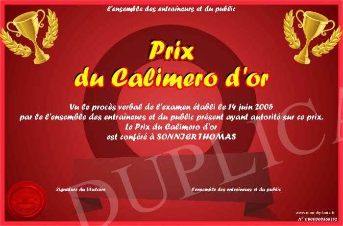 Envoyez par email votre Prix du Calimero d'or personalisé