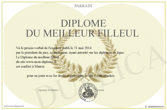 Envoyez par email votre Diplôme du meilleur filleul personalisé