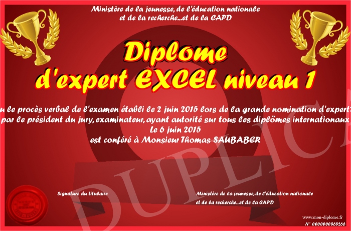 Envoyez par email votre Diplôme d'expert EXCEL niveau 1 personalisé