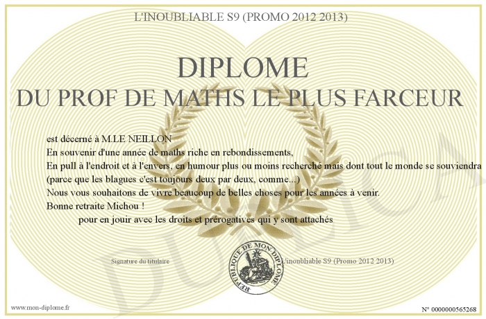 Envoyez par email votre Diplôme du prof de maths le plus farceur personalisé