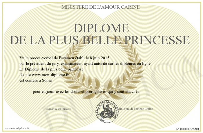Envoyez par email votre Diplôme de la plus belle princesse personalisé