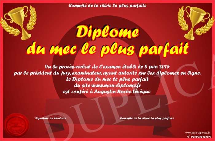 Envoyez par email votre Diplôme du mec le plus parfait personalisé