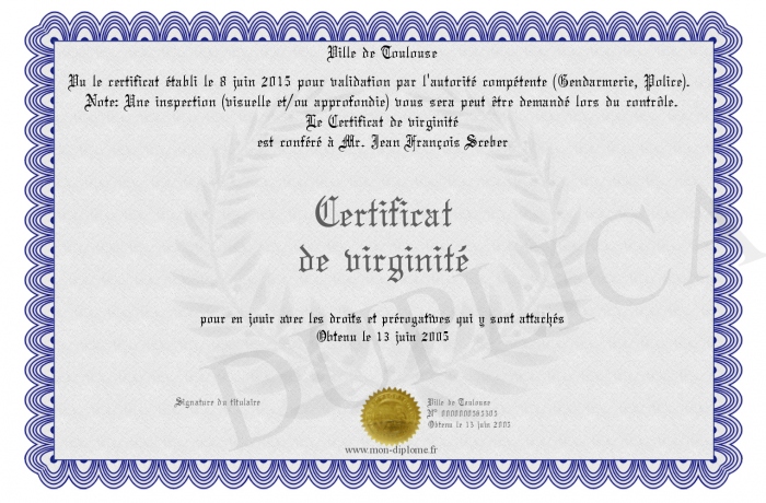 Envoyez par email votre Certificat de virginité personalisé