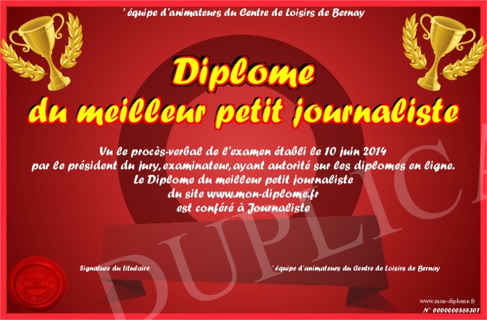 Envoyez par email votre Diplôme du meilleur petit journaliste personalisé