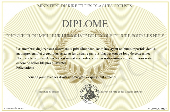Envoyez par email votre Diplôme d'honneur du meilleur humoriste de l'Ecole du Rire pour les Nuls personalisé