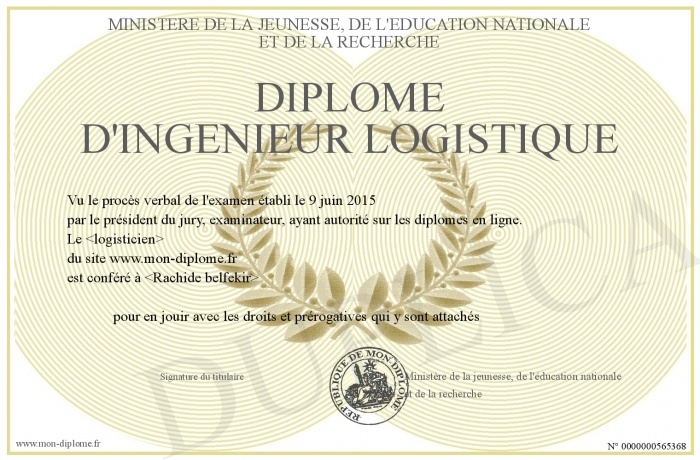 Envoyez par email votre Diplôme d'ingenieur logistique personalisé