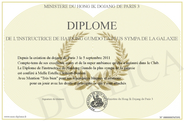 Envoyez par email votre Diplôme de l'instructrice de Haidong Gumdo la plus sympa de la galaxie personalisé